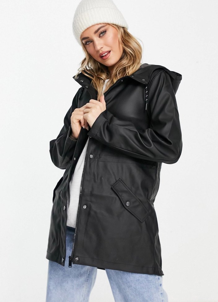 Asos su geçirmez siyah yağmurluk, normal kesime ve notched yaka ile uzun kollara sahiptir. Midi boyda ve kapüşonludur, sokak stilini zahmetsiz şıklıkla birleştirir. Suni deri: mat kaplama. Kaplama: %100 Poliüretan kaplama, Ana Malzeme: %100 Polyester.
