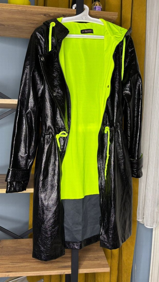 Fermuarlı, siyah deri midi yağmurluk, notalı yaka ve uzun kollu, neon yeşil astarlı, sokak stiline uygun şık tasarım.