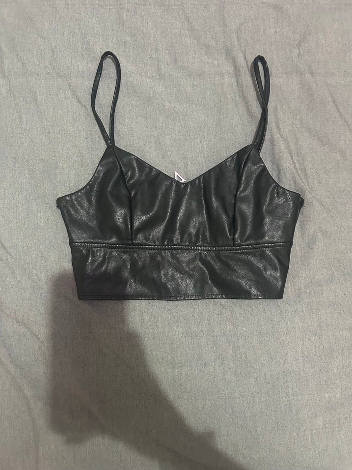 Dar kesim siyah deri mini askılı büstiyer, ince askılarla günlük kullanıma uygun cesur ve zahmetsiz şıklık sunar.