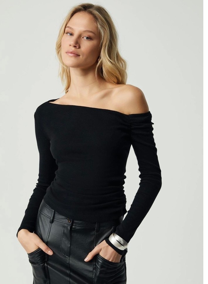 Siyah deri, kısa boy, tek renk ve uzun kollu, tekne yaka, oturan kesim bluz, günlük kullanım için modern ve minimal şıklık sunar.