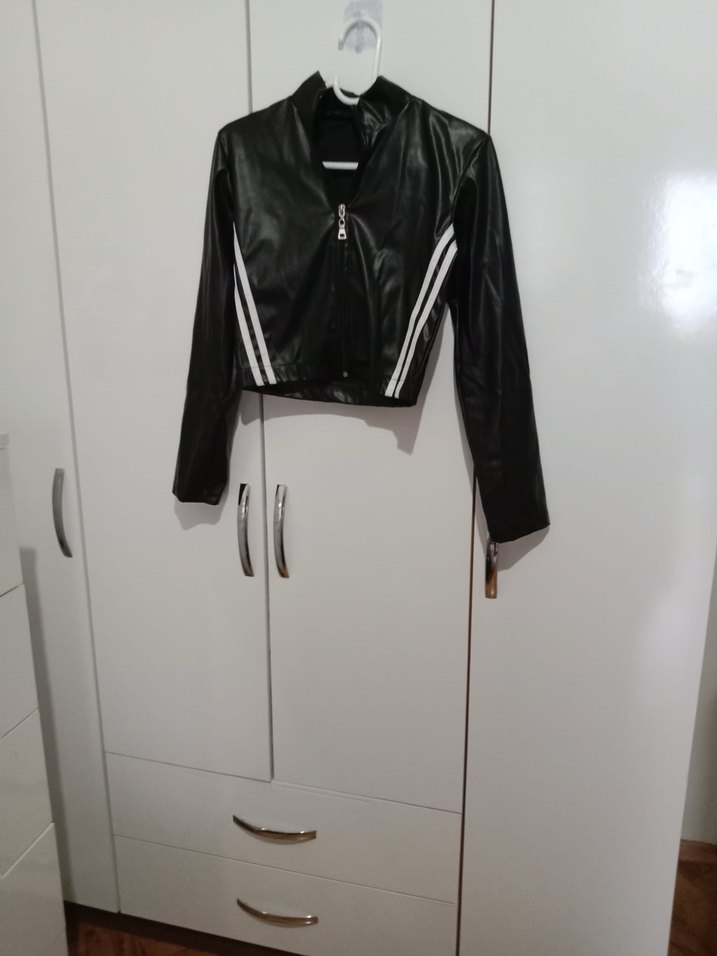 Siyah, yüksek yakalı, fermuarlı ve uzun kollu mini deri ceket. Yanlarda beyaz çizgilerle spor bir hava katıyor.