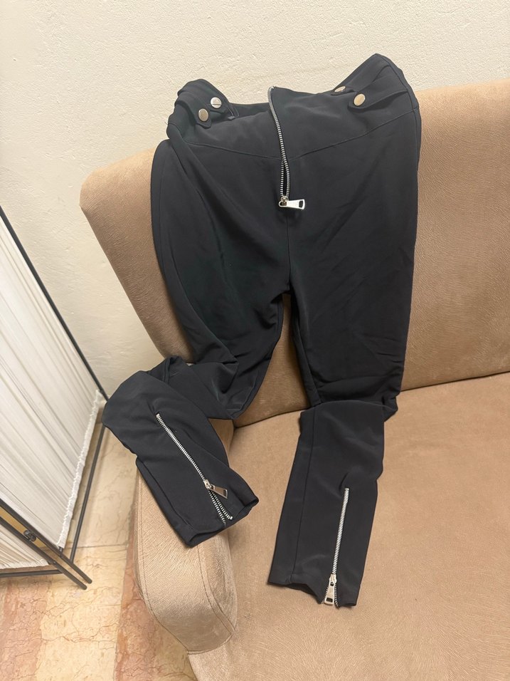 Siyah deri mini dar kesim pantolon, ön ve bileklerde fermuar detaylarına sahip, trend sokak stili için uygun.