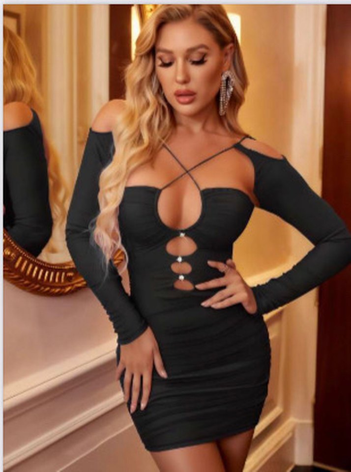Bu siyah deri mini elbise, uzun kollu ve omuz dekolteli, askısız yakalı ve çapraz askılıdır. Dantel detaylarıyla romantik geceler için uygundur.