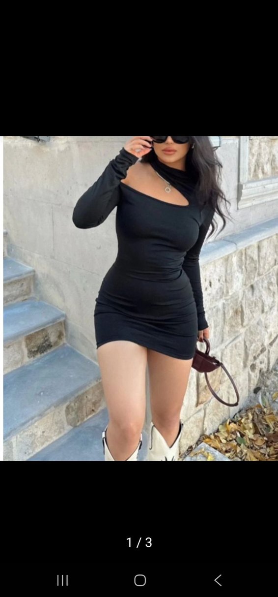 Dar kesim siyah deri mini elbise, uzun kollu ve yüksek yakalı, asimetrik kesim detaylıdır. Dış mekan sokak stili için zahmetsiz şıklık sunar.