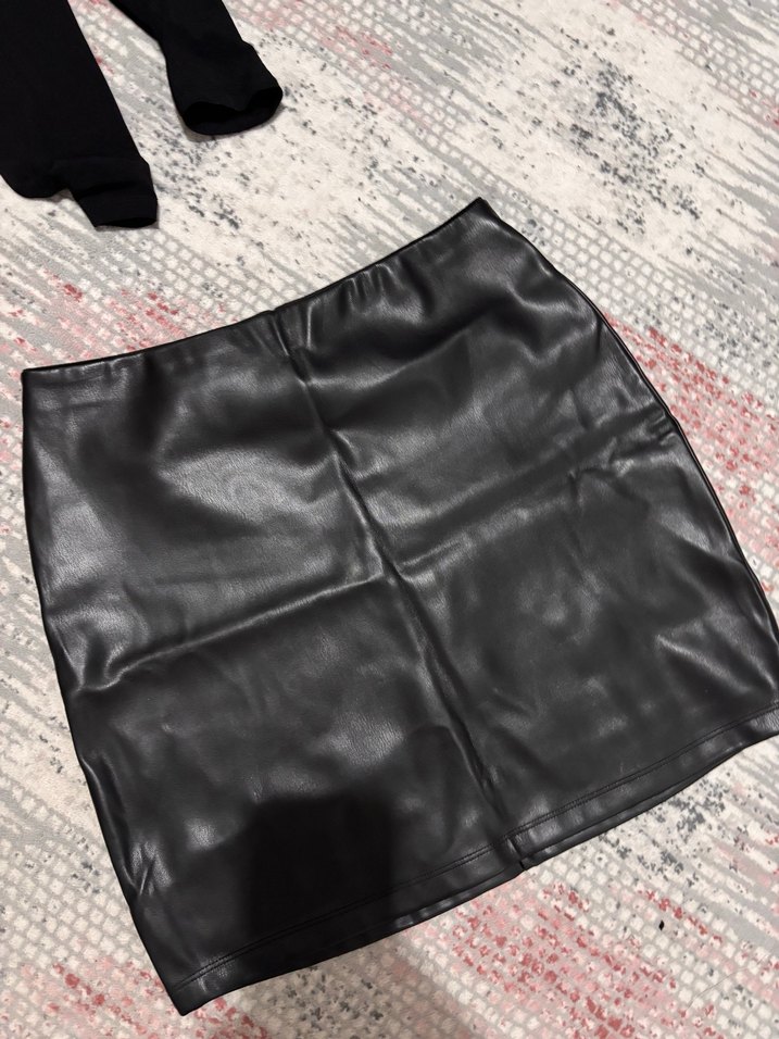 Deri siyah mini etek, vücuda oturan kesimi ve düz yüzeyiyle romantik akşamlar için cesur ve şık bir tercih. Midi boyda, desensiz.