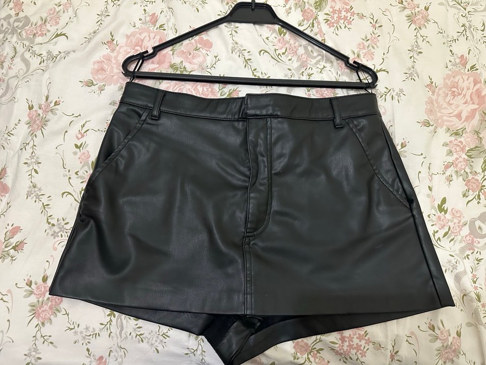 Siyah deri, kemerli içi polarlı mini etek