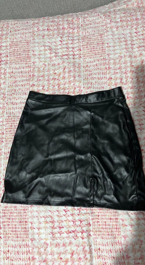 Siyah deri mini etek, bel kemerli ve dar kesim. Günlük kullanıma uygun, Paris tarzı sokak giyimine uyum sağlar.