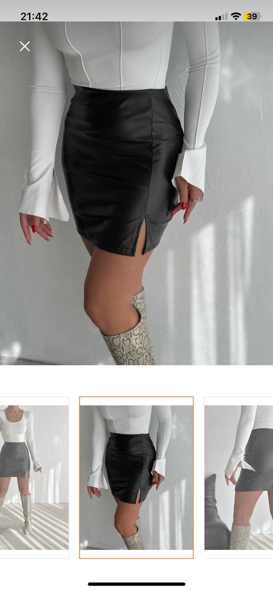 Hafif yırtmaç detaylı,siyah deri mini etek. Gotik ve Paris tarzını romantik buluşmalar için buluşturur. 1 kere giydim üstündeki izler katlama izidir hiç bir sorunu yoktur