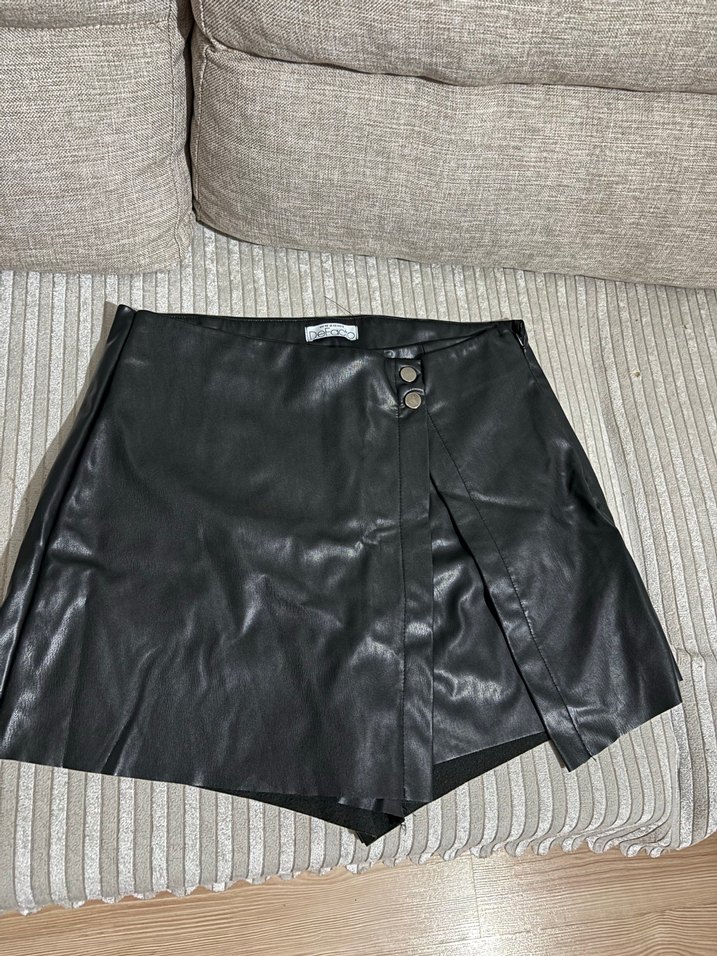 Kemerli, siyah deri mini şort etek, sıkı kesimi ve pürüzsüz dokusuyla dikkat çekiyor. Trendy günlük sokak tarzına uygun.
