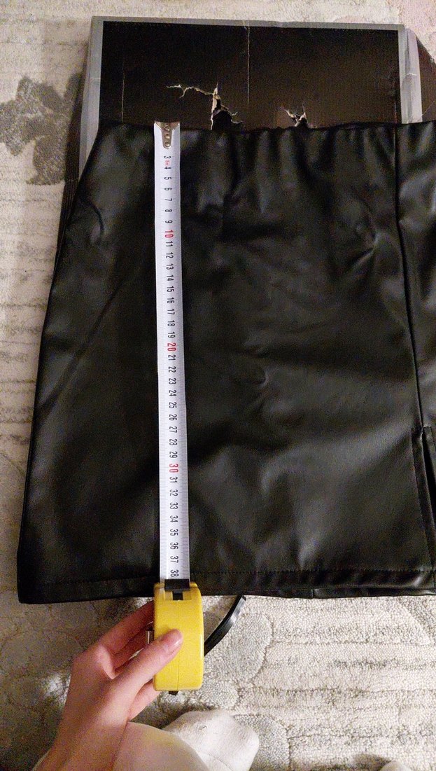 Deri siyah mini etek, düz kesim ve ölçü bandıyla uzunluğu gösteriliyor.