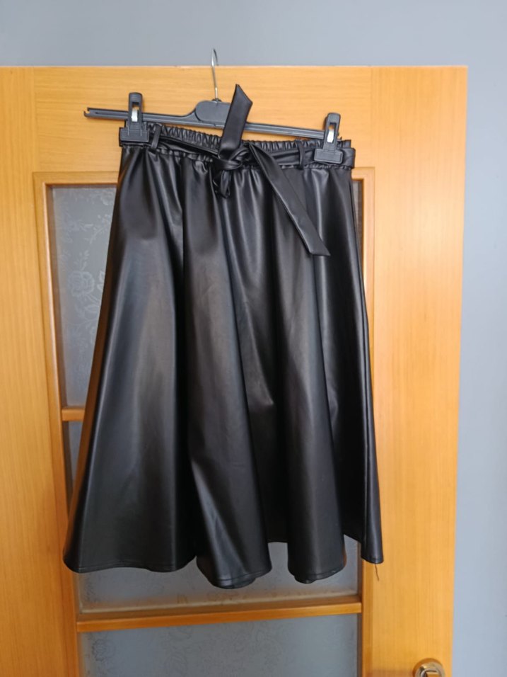 Siyah Deri Mini Etek, Kemerli, Gevşek Kesim