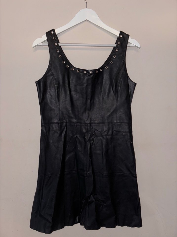 V yaka, kolsuz, metal halkalı detaylı siyah deri mini elbise. Bel kemeri bulunur, gotik tarzda günlük kullanıma uygundur.