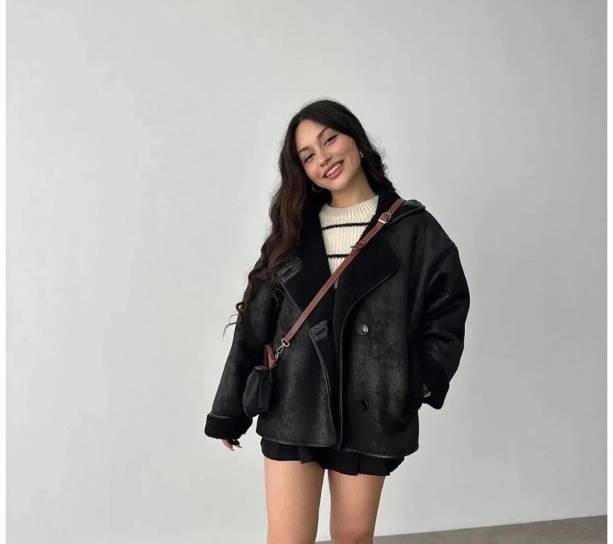 Siyah deri, kısa kesim, notlu yaka ve askılı kollara sahip rahat kesim kadın ceket, günlük kullanım için zahmetsiz şıklık sunar.