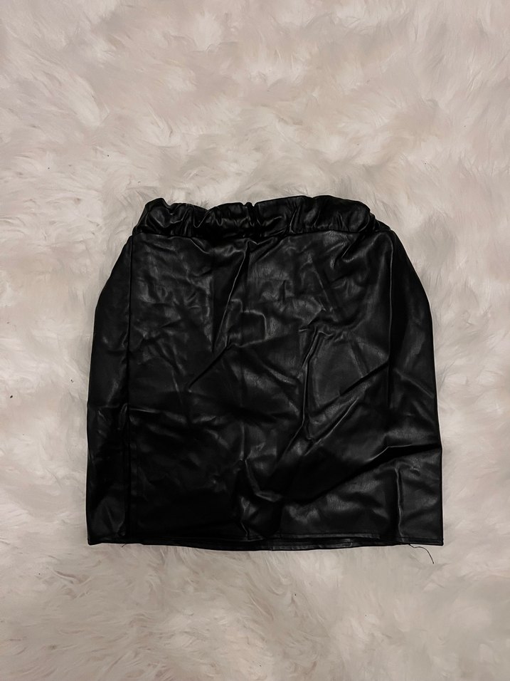 Siyah deri detaylı, vücuda oturan mini etek, sokak modasına uygun ve günlük kullanıma elverişli.