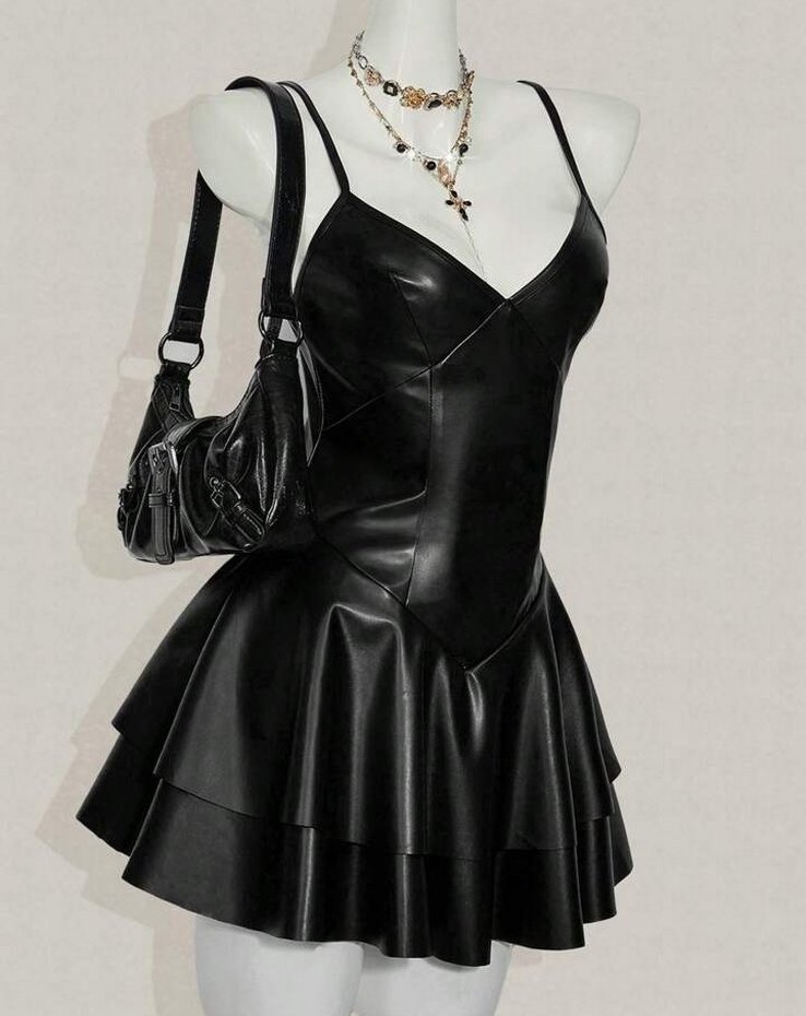 Siyah Deri Mini Kat Kat Elbise