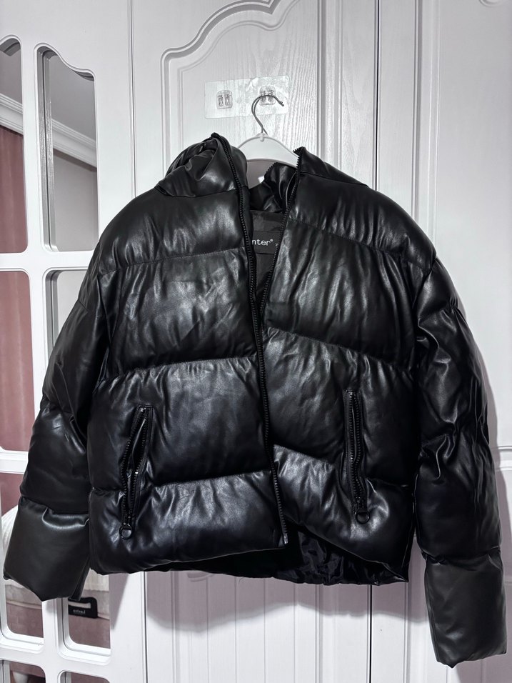 Siyah deri, kemerli ve yüksek yakalı bu mini kadın kışlık ceket, sokak stiline uygun, genç ve trend takipçileri için ideal bir parça.