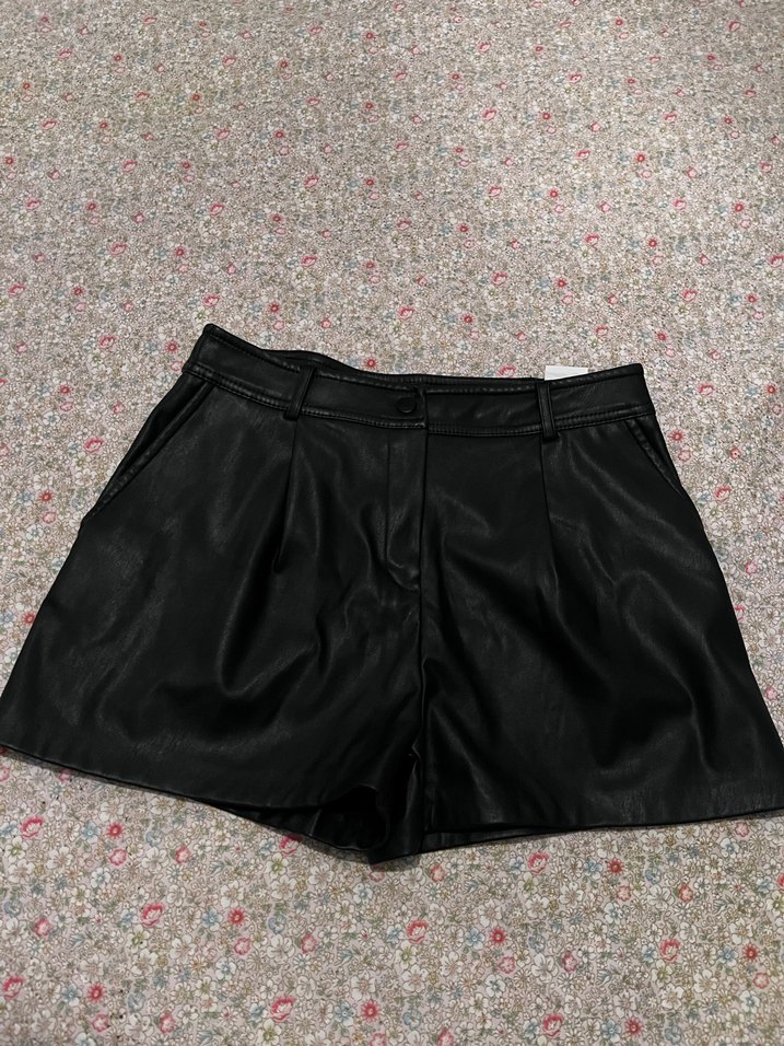 Siyah deri, kemerli, bol kesim mini şort. Trendy günlük sokak stili için uygundur.