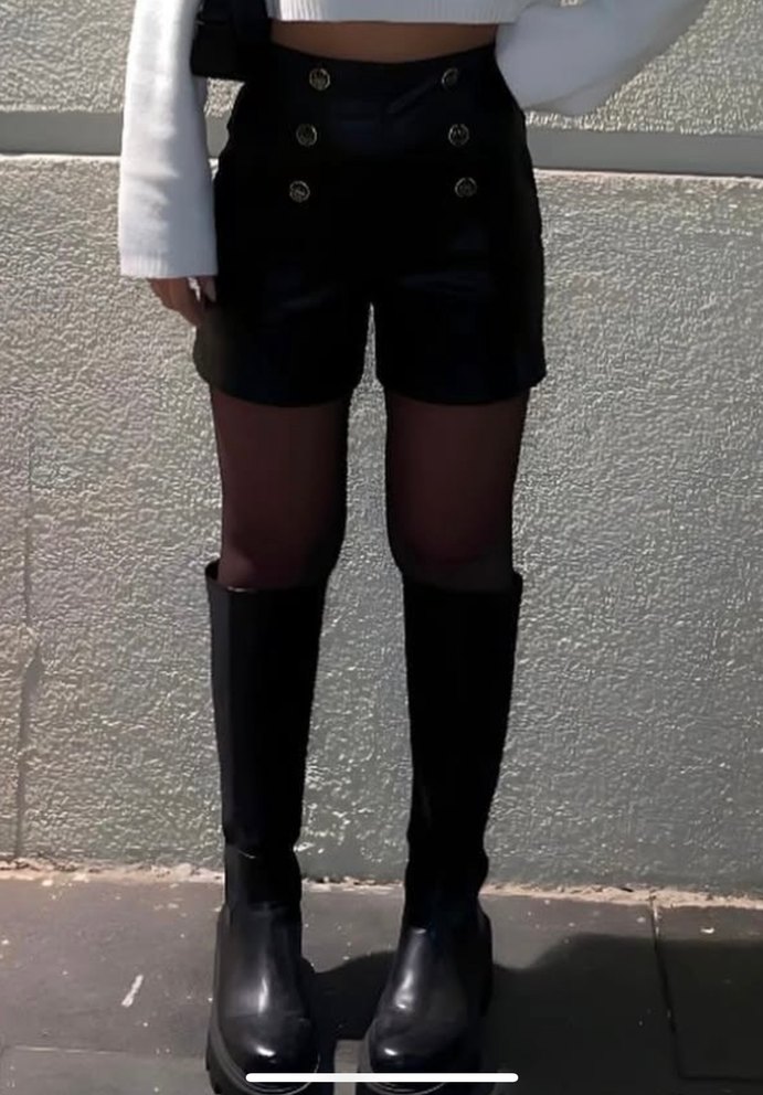 Düğme detaylı, siyah deri mini şort. Sokak stiline uygun, kısa ve sade tasarım.