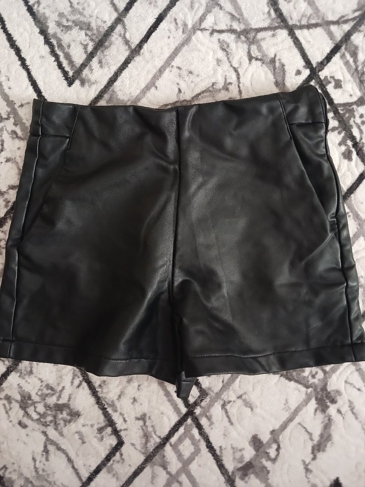 Kemerli bel ve düz desenli, siyah deri şortlar. Sıkı kesimiyle gotik tarzda cesur bir görünüm sağlar.