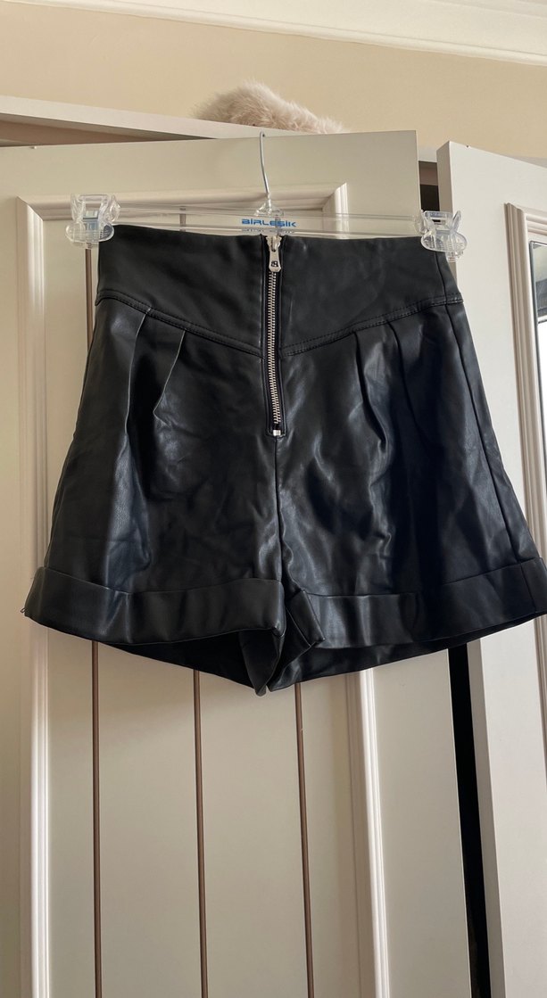 Siyah Deri Mini Şort Fermuarlı