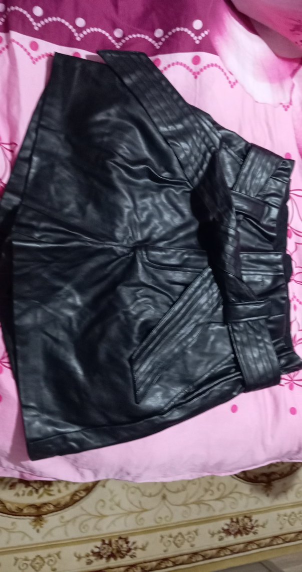 Siyah deri mini şort, kemerli ve vücuda oturan kesime sahip. Desensiz, düz yüzeyiyle günlük gotik tarz için uygun.