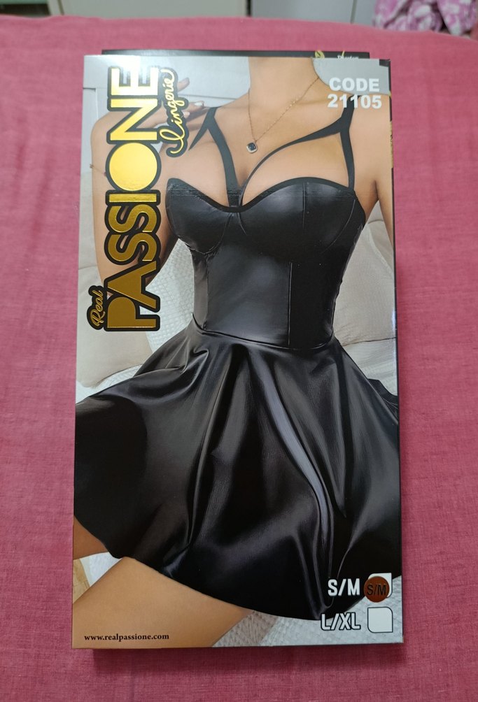 Parlak deri mini elbise, straplez ve kayış detaylı kollara sahip. Sıkı kesimi ve baskılı deseniyle göz alıcı bir parti elbisesi. S/M ve L/XL bedenleri mevcut.