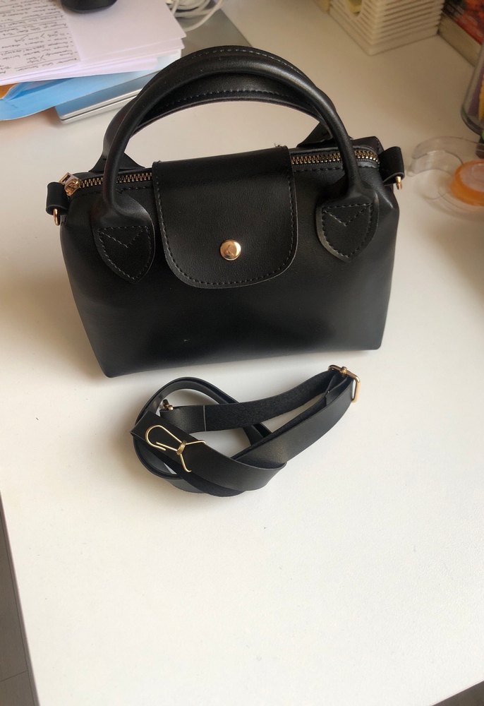 Siyah deri, tokalı askılı, minimalist tasarımlı ve desensiz kadın çantası. Günlük kullanım ve sokak stiline uygundur.