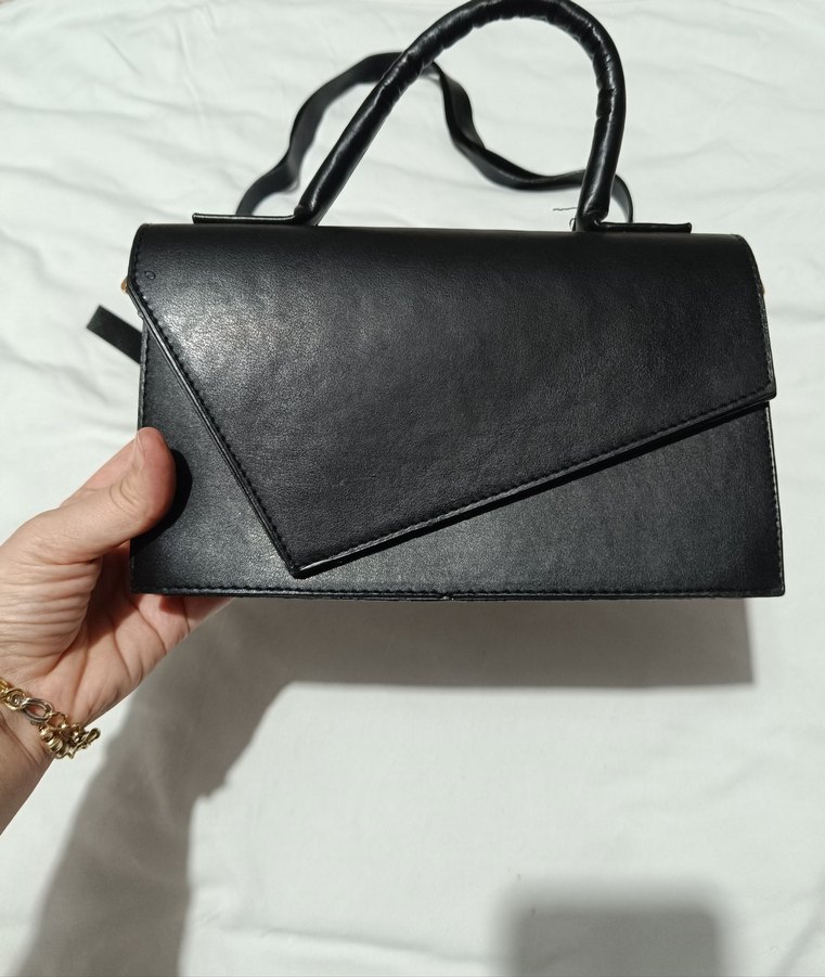 Siyah deri, minimal tasarımlı kadın çanta. Tokalı kapak ve şık sapıyla günlük kullanıma uygun, desensiz ve koyu goth tarzında.