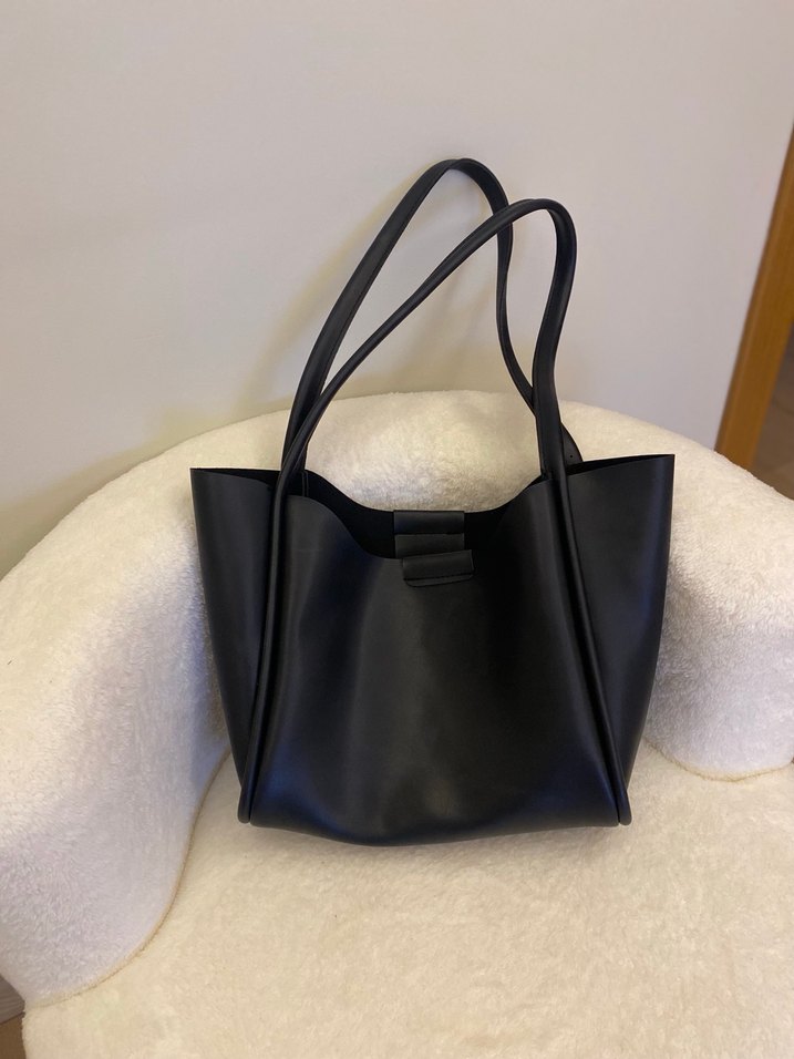 Uzun kulplu, desen içermeyen siyah deri kadın çanta, minimalist ve günlük kullanıma uygun şık tasarım. markası belirsz