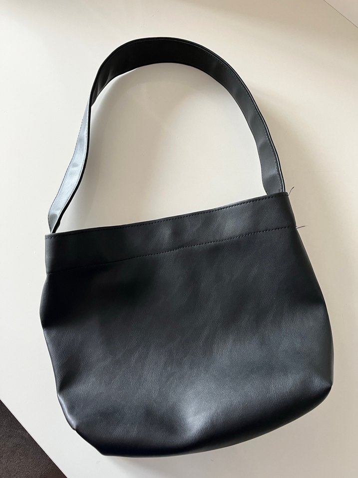 Siyah deri, desen içermeyen minimalist tasarımlı geniş askılı kadın çantası, günlük kullanıma uygun rahat şıklık sunar.