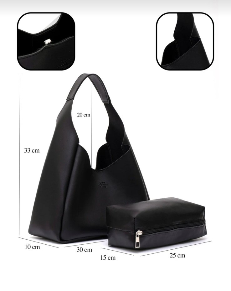 Siyah deri, desen içermeyen minimalist tasarımlı kadın çanta. Normcore stilde, günlük kullanıma uygun, zahmetsiz şıklık sunar. içinde makyaj çantası var. yeni
