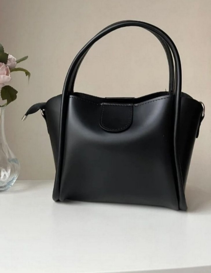 Siyah deriden üretilmiş, desen içermeyen minimalist tasarıma sahip çift saplı kadın çantası, günlük kullanım için şık ve sade. 2renk mevcut tur siyah ve kahverengi