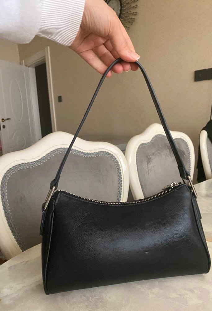 Siyah deri, tokalı askılı, desen içermeyen minimalist kadın çantası. Günlük kullanıma uygun, trend sokak tarzına uyum sağlar.