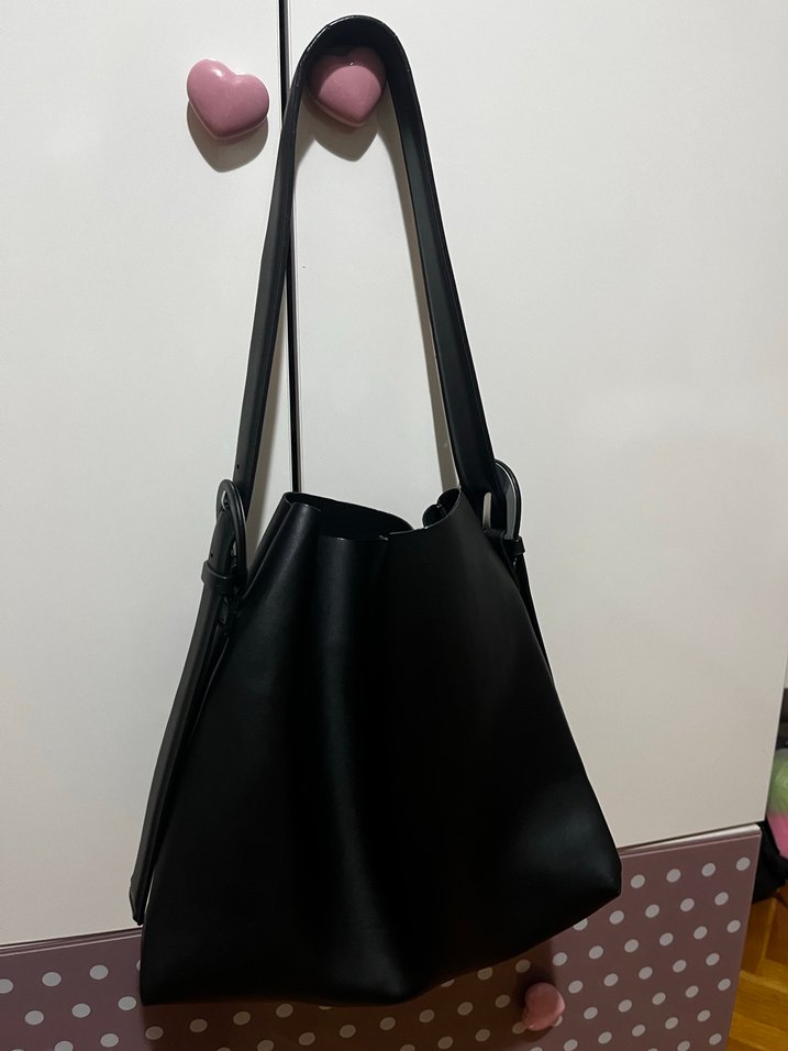 Zara muadili siyah deri kadın çanta, minimalist tasarımlı ve tokalı kayışlara sahip. Günlük kullanım için uygun, gotik tarzda ve modaya uygun bir parça. Hasarı yok, fermuarlı gözü var. İçi boş olduğu için fotolarda garip çıkmış
