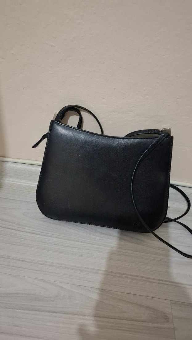 Gündelik kullanıma uygun, tokalı detaylı siyah deri minimalist goth tarzı kadın çantası. sadece fermuar ucu kırık