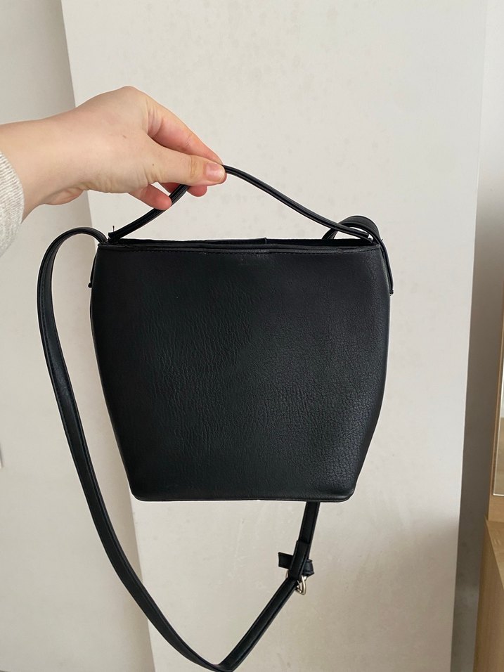 Siyah deri, minimal tasarımlı kadın çanta. Tokalı askısı ve desensiz, sade stiliyle sokak modasına uygun.