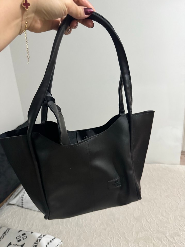 Siyah deri ve desen içermeyen minimalist tasarıma sahip bu kadın çantası, günlük kullanım için uygun rahat bir sokak stili sunar. Kullanmıyorum diye satıyorum herhangi bir defosu yok