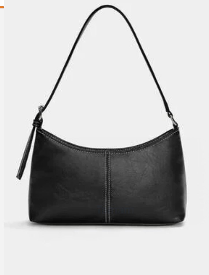 Siyah deri, tek omuz askılı minimalist kadın çantası. Düz yüzeyiyle günlük kullanım için uygun, sokak stiline uyumlu şık ve sade tasarım.