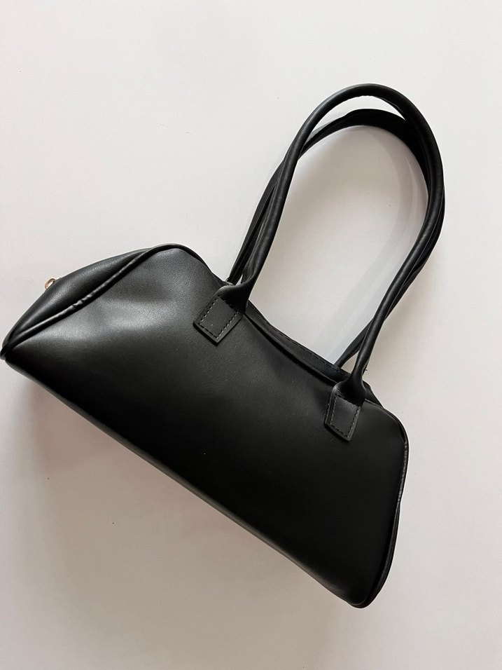 Siyah deri, minimalist tasarımlı kadın çantası, uzun saplı ve gündelik kullanıma uygun goth tarzında.