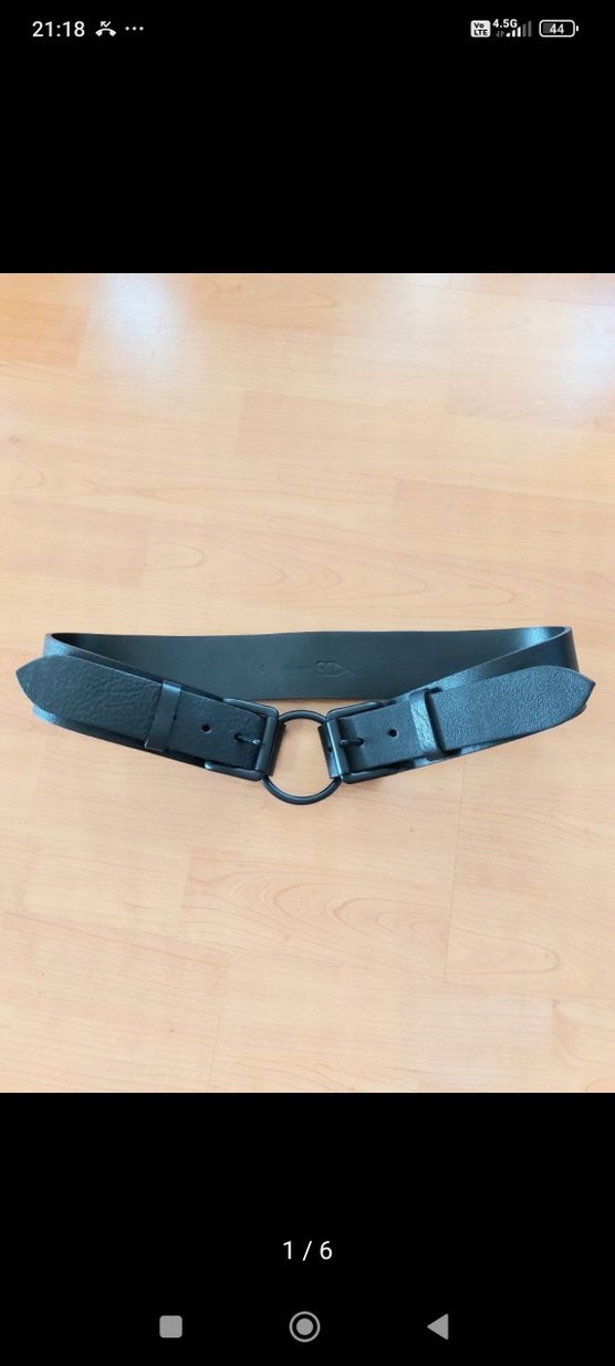 Siyah deri çift bantlı, ortasında halka detaylı minimalist gotik tarzda kadın kemeri. Moda öncüleri için avant-garde bir görünüm sunar.