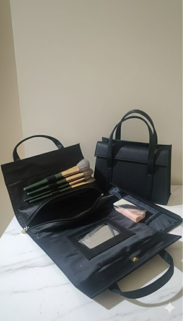 Siyah deri, minimalist tasarımlı makyaj çantası; fırçalar ve kozmetikler için çoklu bölmeler içerir, günlük kullanımda zahmetsiz şıklık sunar.