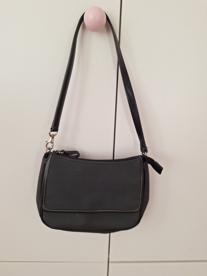 Siyah deri, kemerli detaylı minimalist kadın omuz çantası. Sokak tarzına uygun, desensiz ve günlük kullanım için ideal.