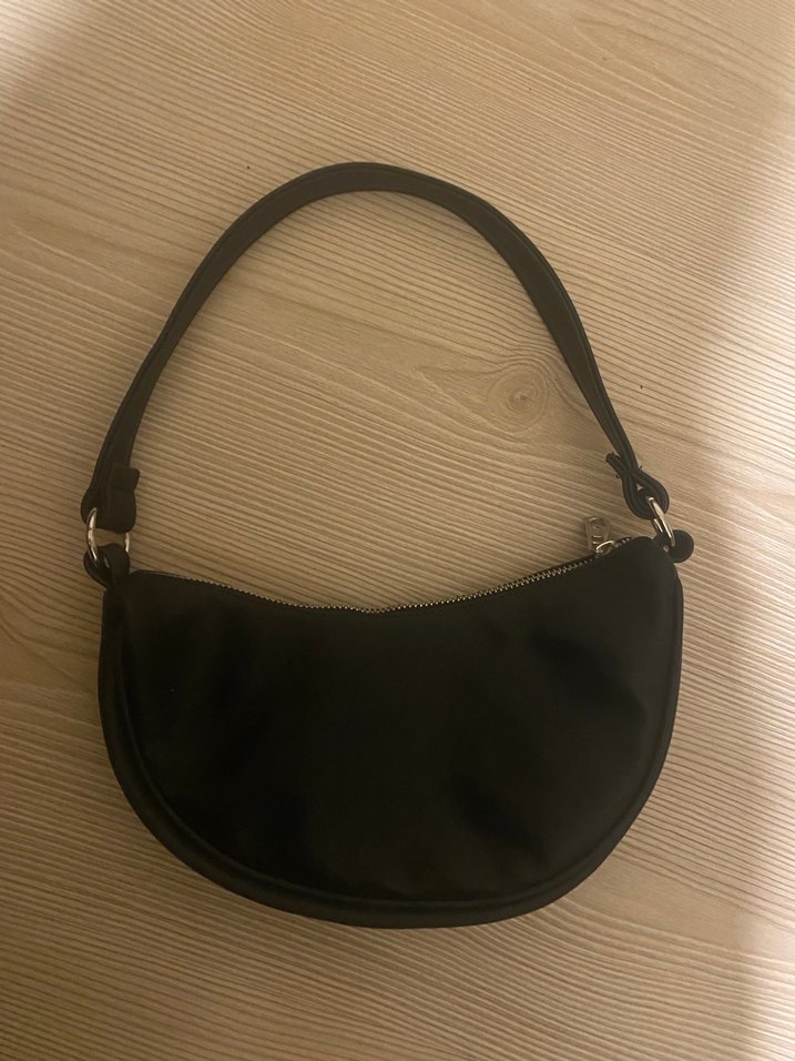 Siyah deri, tokalı askısı ve desen içermeyen sade tasarımıyla günlük kullanıma uygun minimalist kadın omuz çantası.