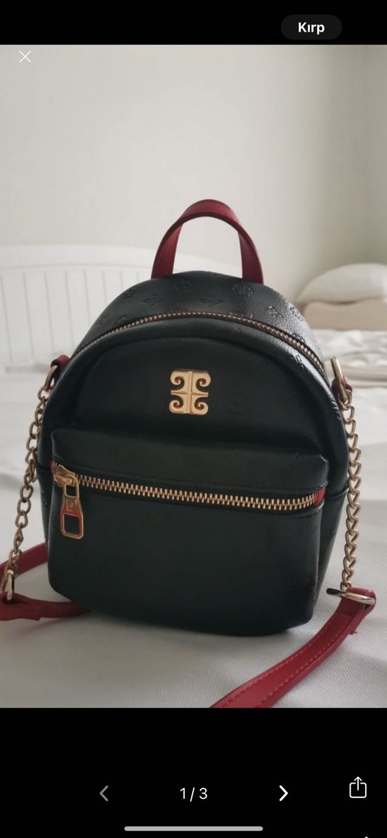 Siyah deri ve baskılı desenli, fermuarlı bölmeleri ve altın zincir detayları olan minimalist kadın sırt çantası, modern klasik tarzı günlük kullanıma sunar.