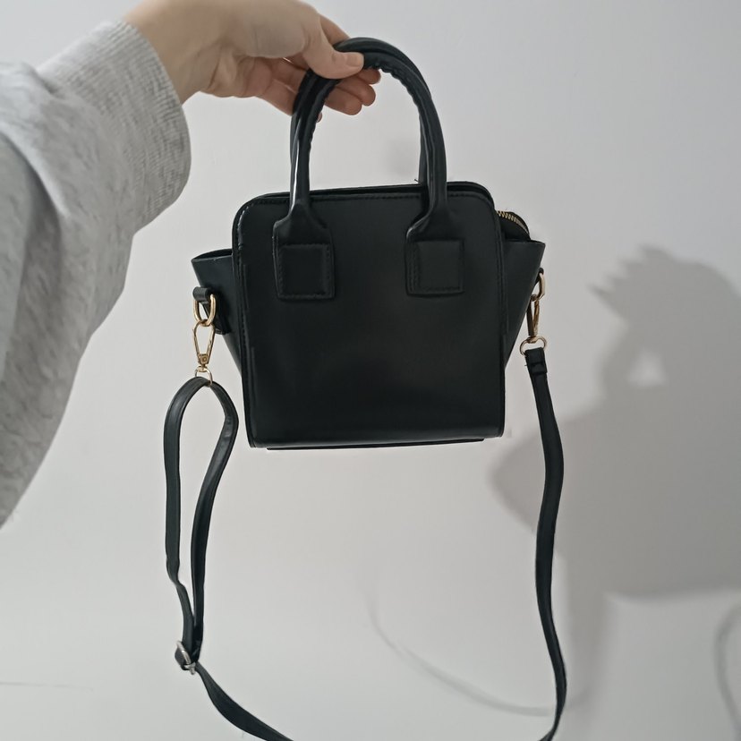 Siyah deri çanta, tokalı ve minimalist goth tarzında. Üst saplı ve ayarlanabilir omuz askılı, günlük kullanıma uygun.