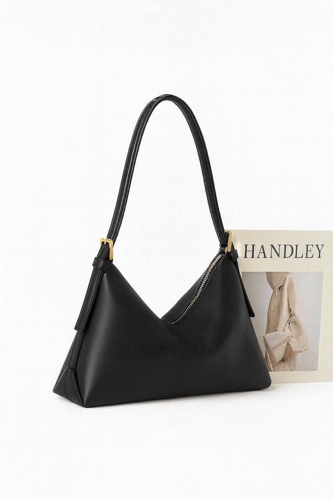Siyah deri kadın çanta, modern klasik tarzda ve minimalist tasarıma sahiptir. Günlük kullanım için zahmetsiz şıklık sunar, HANDLEY markalıdır.