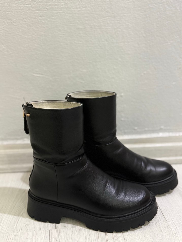 Siyah deri, tokalı, blok topuklu kadın botları, minimalist gotik tarzda, günlük kullanıma uygun. Tam kalıptır. Hiçbir defosu yoktur. Birkaç kez giyilmiştir.Su geçirmez.