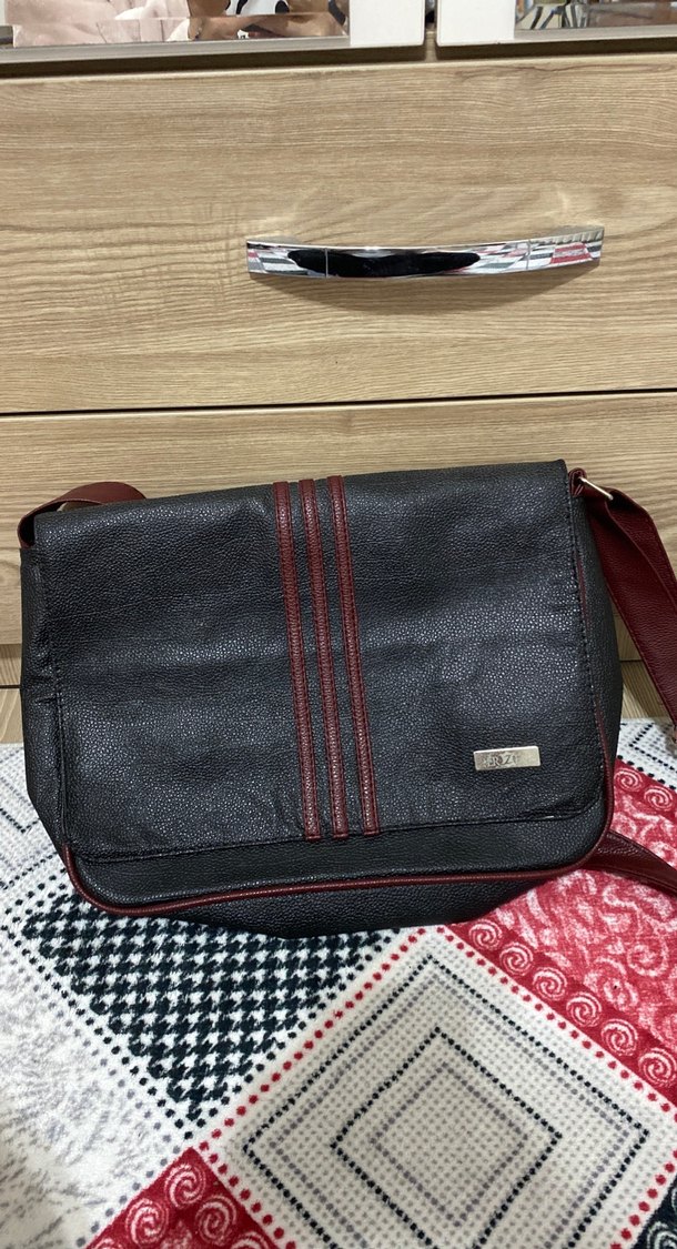 Siyah deri ve tokalı kapaklı omuz çantası, desen içermeyen koyu renkte, sokak tarzına uygun. Günlük kullanım için ideal.