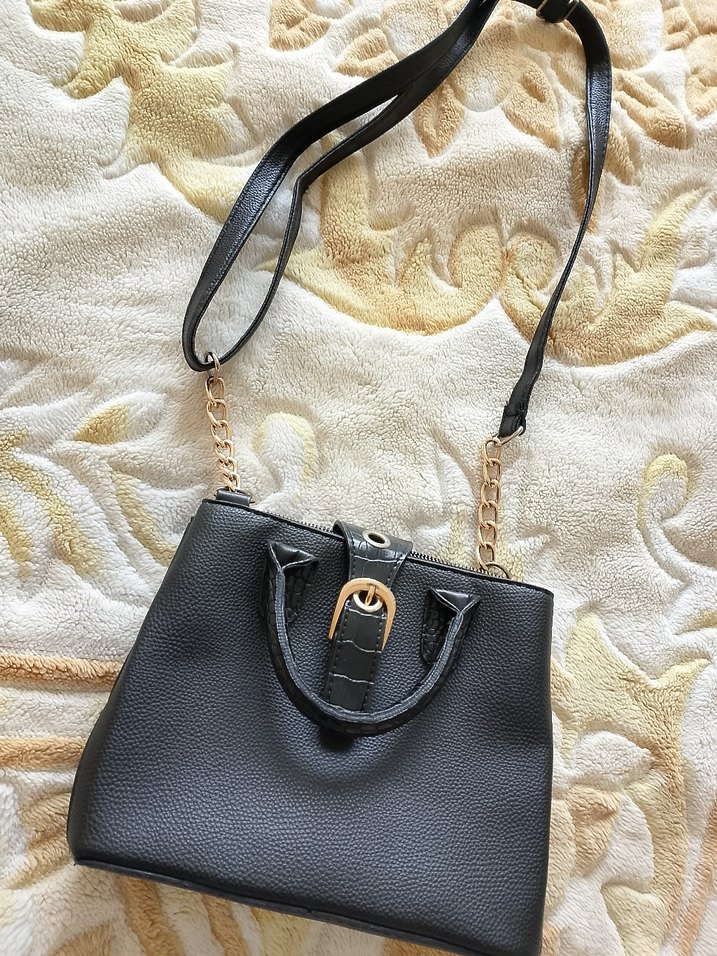 Siyah deri, tokalı ve yılan derisi dokulu çanta. Zincir ve deri askısı ile farklı taşıma seçenekleri sunar. Günlük sokak stili için uygun.