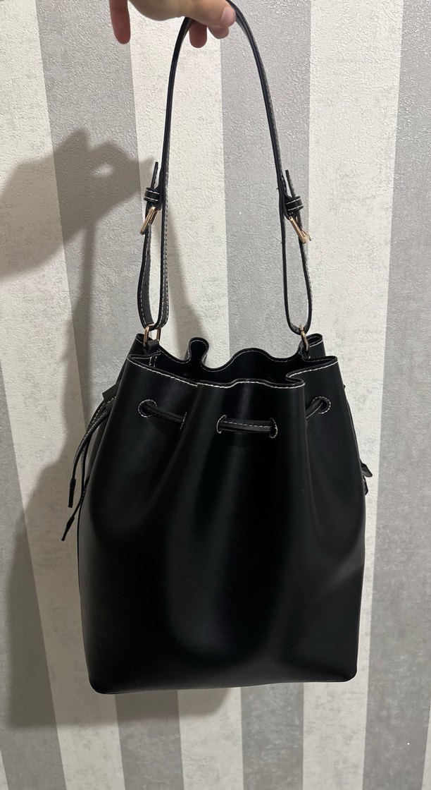 H&M marka siyah deri beyaz dikişli tote bag, içine bayağı eşya alıyor 10.9 ipad dahil defterle görünümünü de ekledim hasarı yok. Siyah deri ve tokalı askıya sahip, minimalist tasarımlı kadın omuz çantası. Günlük kullanıma uygun, trend sokak stili için ideal.